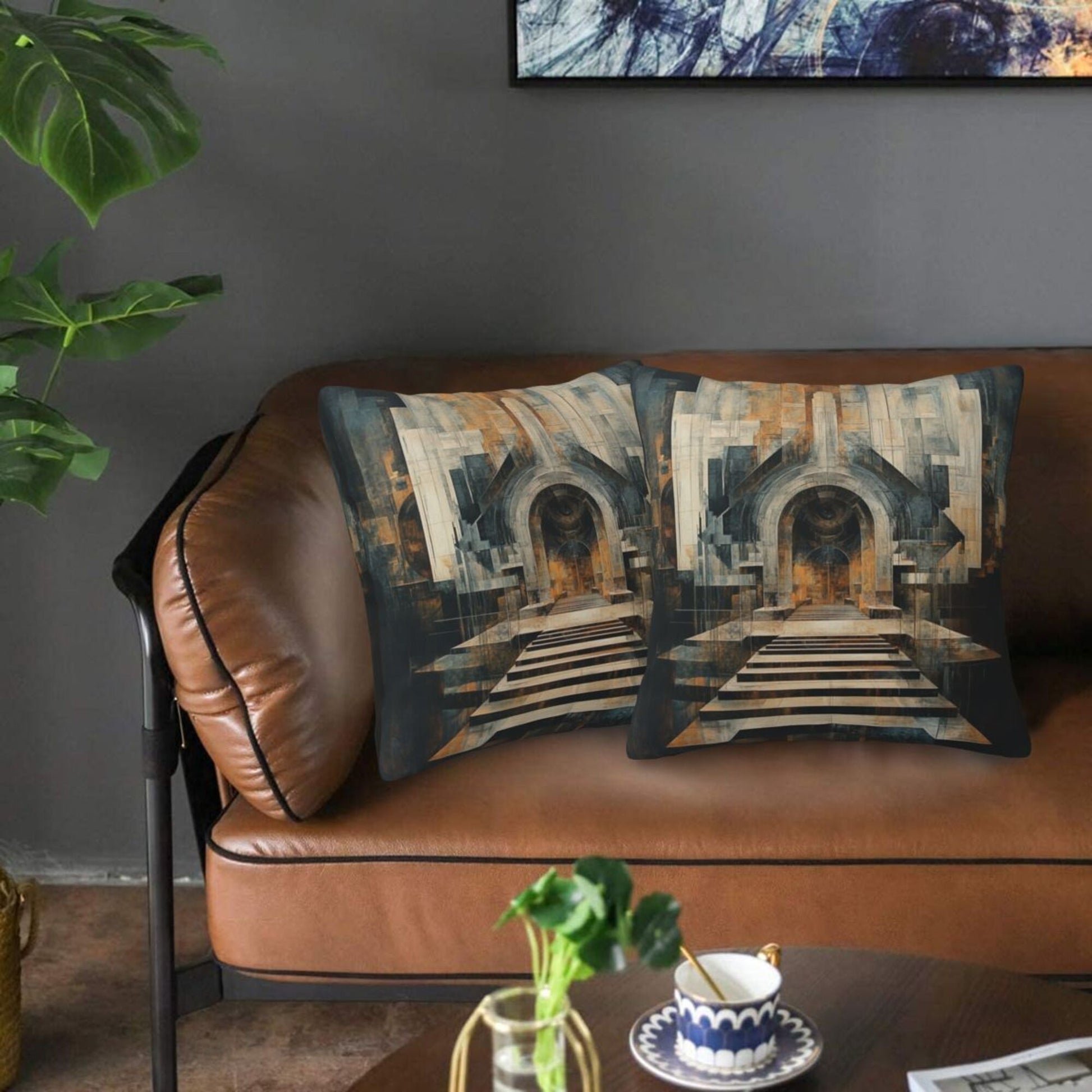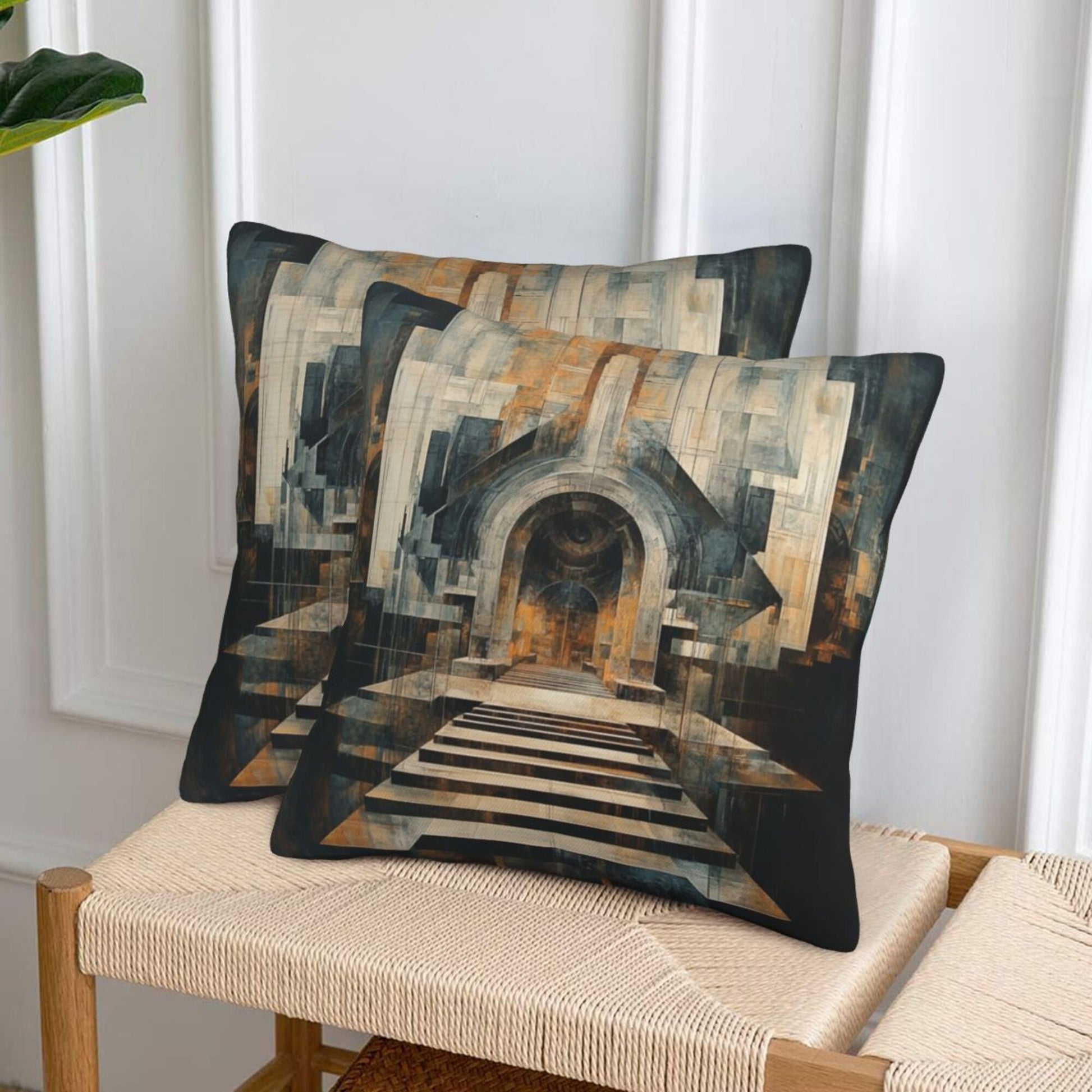 Step into a world of form and depth with this set of two 16"x16" pillow covers, featuring a captivating architectural staircase and archway design. With sharp lines, symmetrical steps, and rich perspective, this piece echoes both classical construction and abstract modernism, making it a bold and evocative accent for any space.