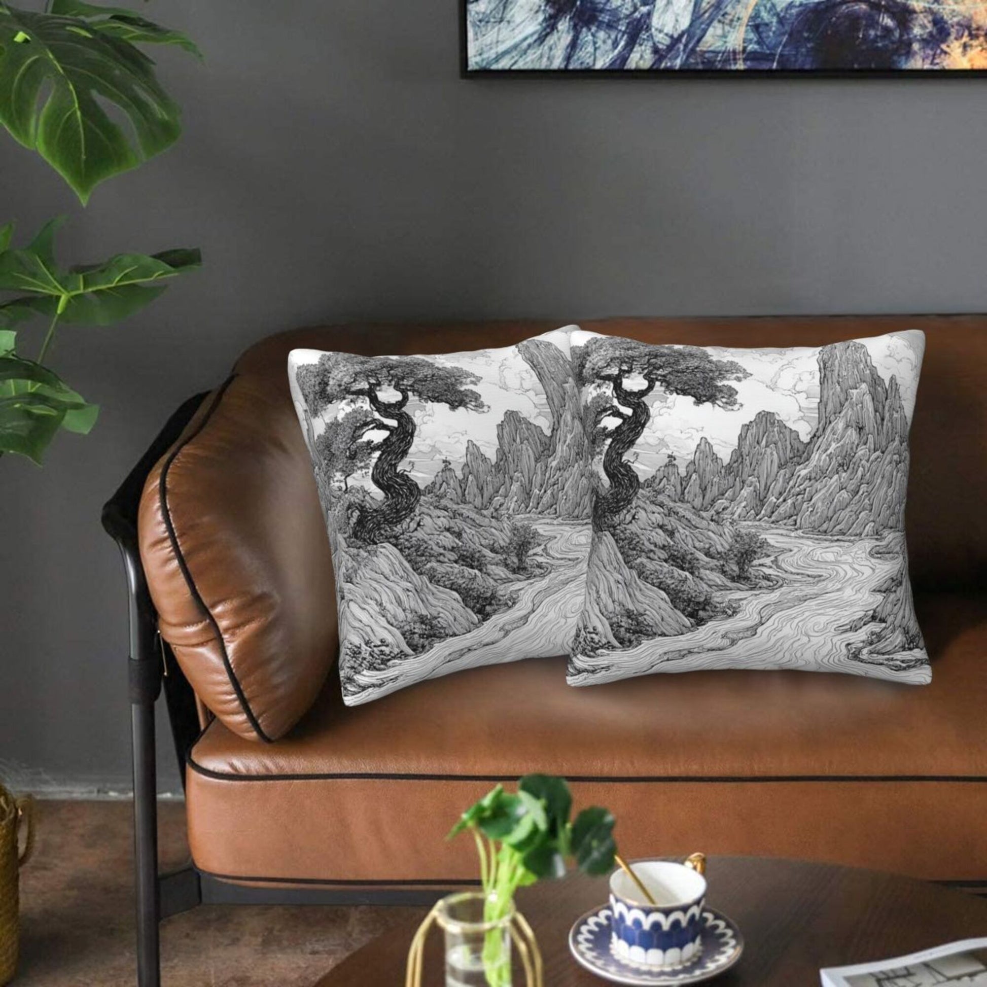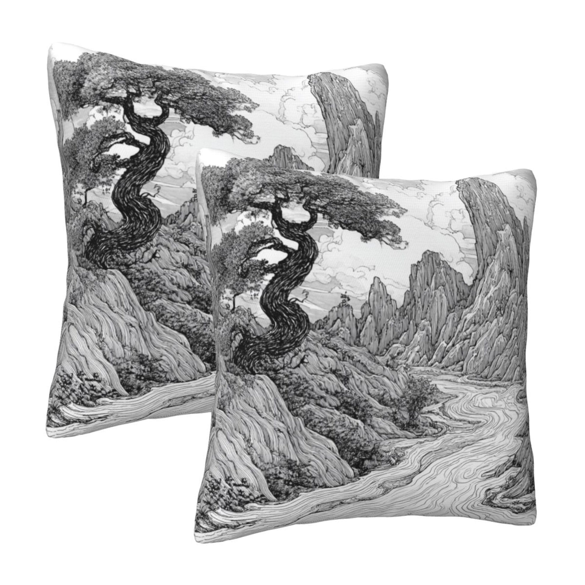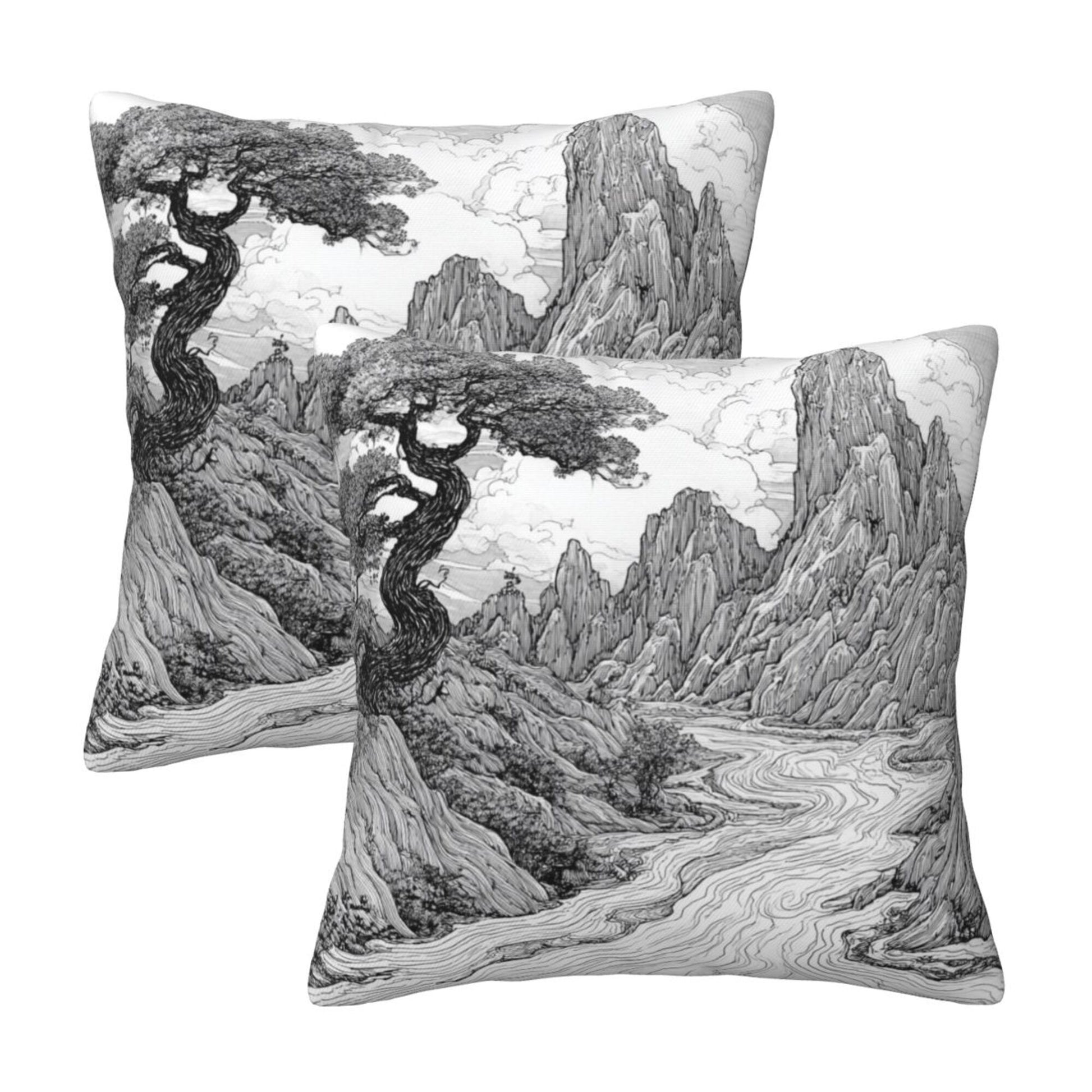 Immerse your space in timeless elegance with this set of two 16"x16" pillow covers, inspired by traditional Chinese landscape painting. The intricate black-and-white linework captures a serene natural scene: ancient pines, rugged mountains, flowing rivers, and drifting clouds—evoking a sense of tranquility, wisdom, and poetic beauty rooted in Eastern aesthetics.