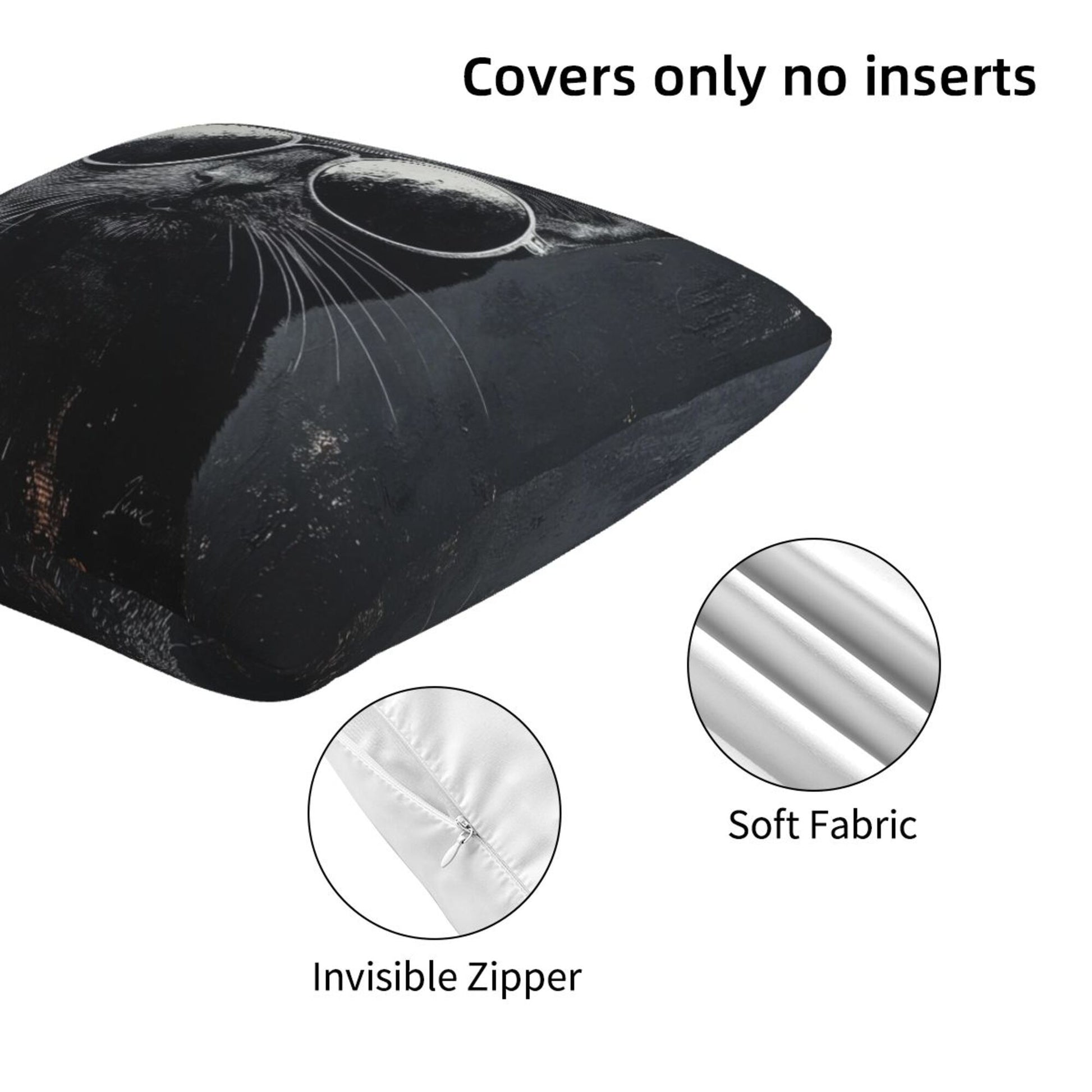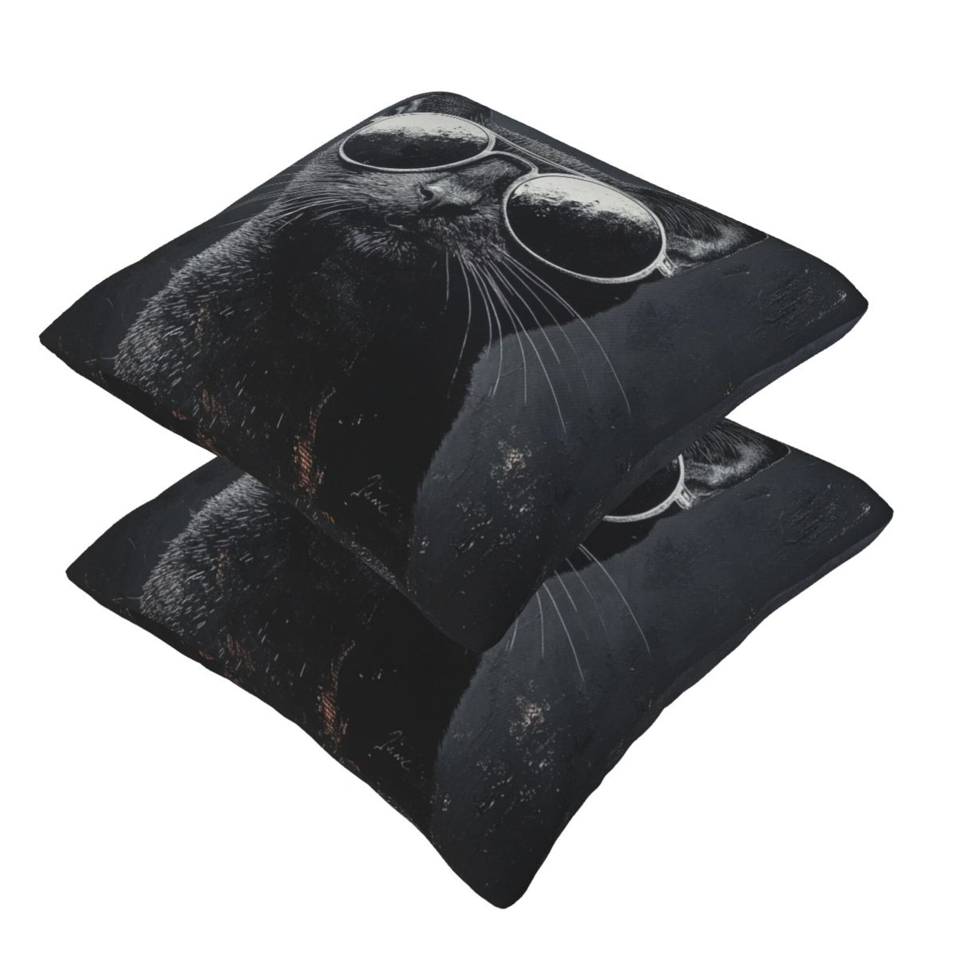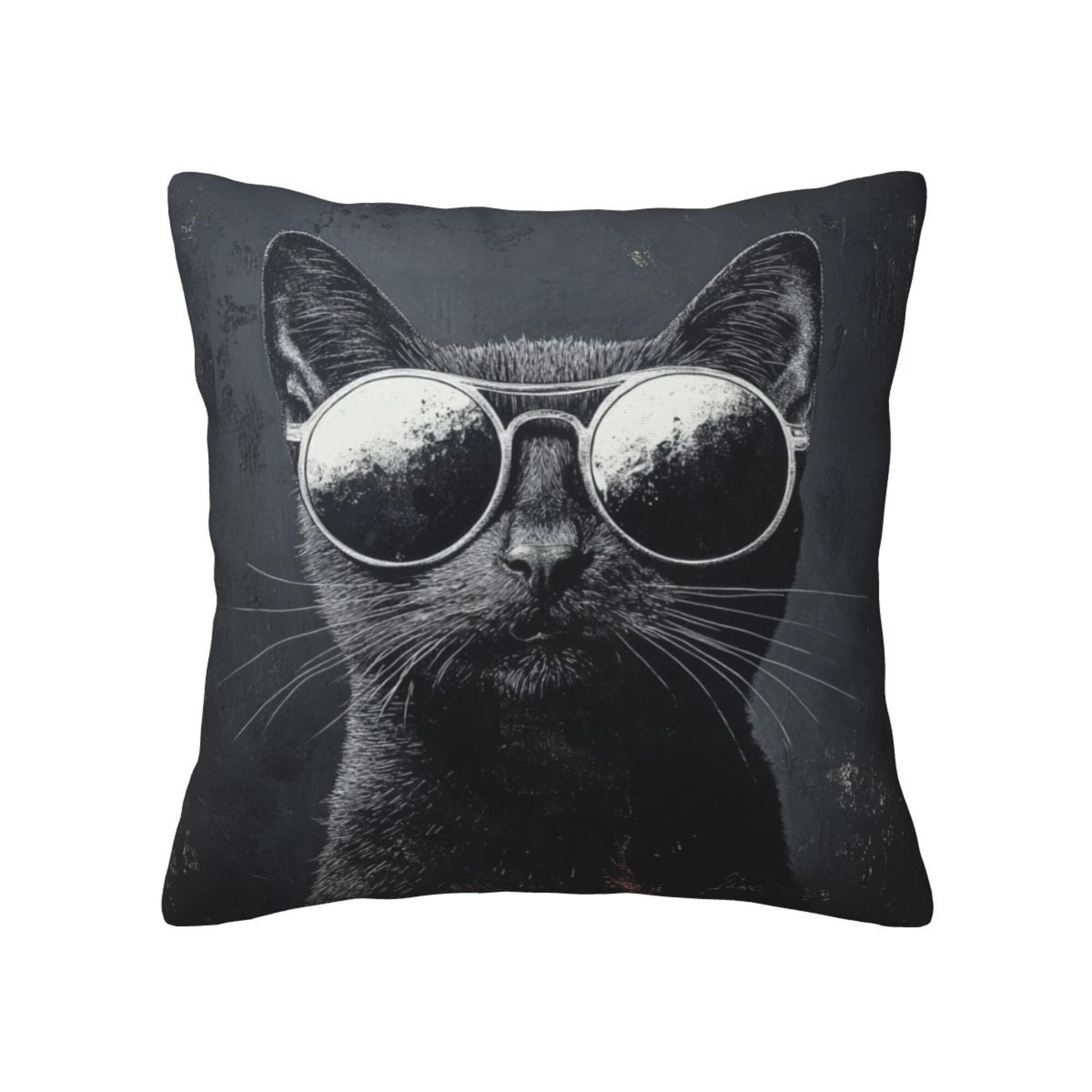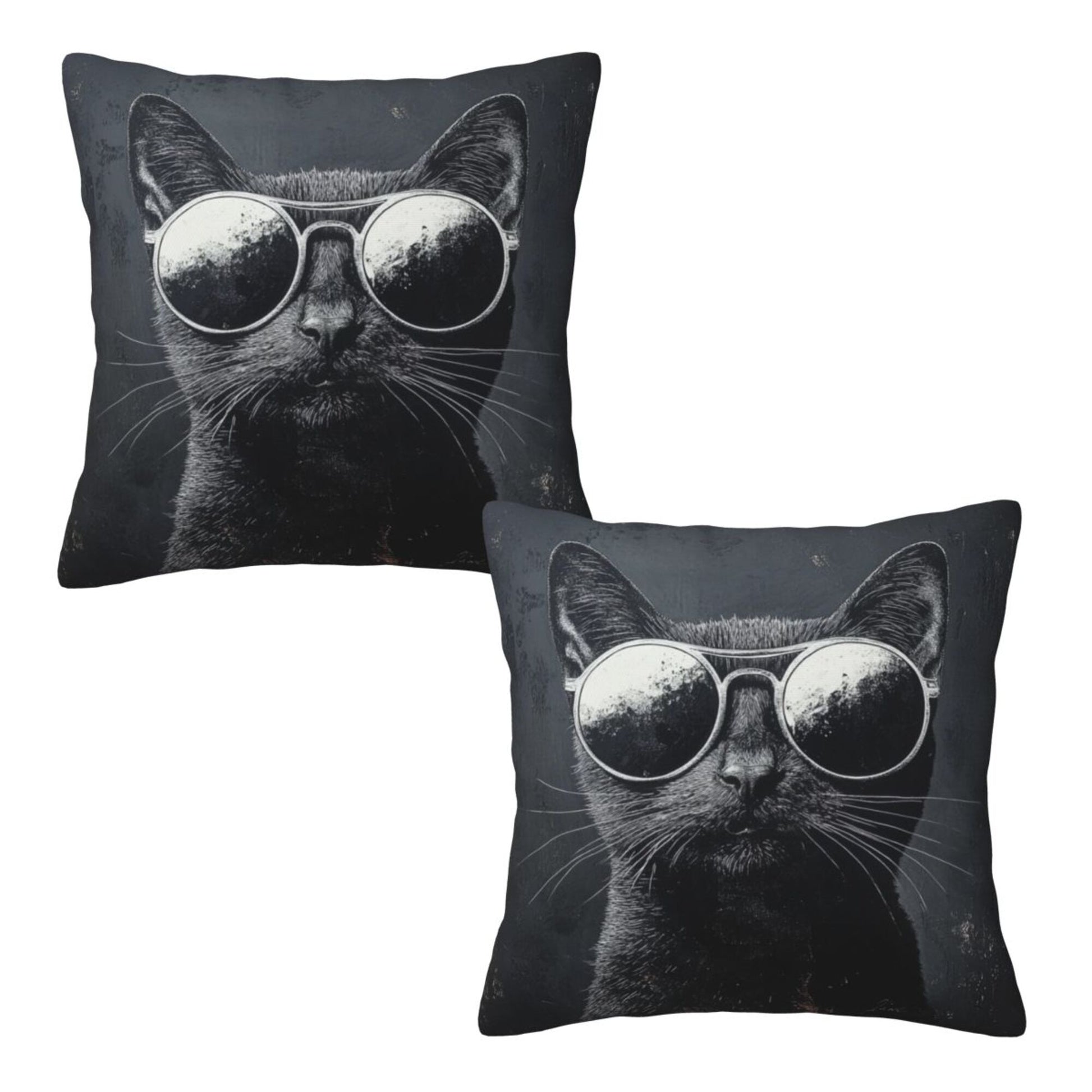 The cat’s fur is rendered with detailed texture in charcoal tones, while the reflective shades make a dramatic, playful contrast. The dark background emphasizes the feline’s mysterious and confident aura. Whether tossed on a sofa, bed, office chair, or dorm bench, these covers are guaranteed to spark smiles and admiration.