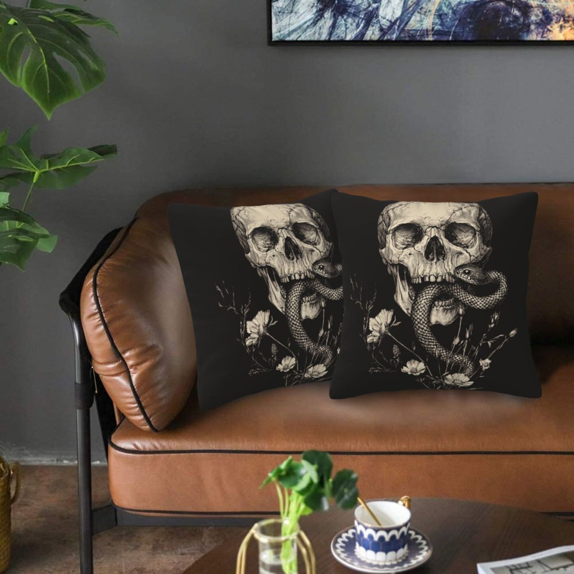 The skull stares hollowly forward while a coiled snake slithers through its jaw, creating powerful tension and drama. Subtle wildflowers growing below introduce delicate balance, creating an interplay of decay and life. Whether you're styling a dark-themed bedroom, Halloween display, rock music studio, gothic lounge, or creative gallery, these pillow covers embody bold, expressive decor.